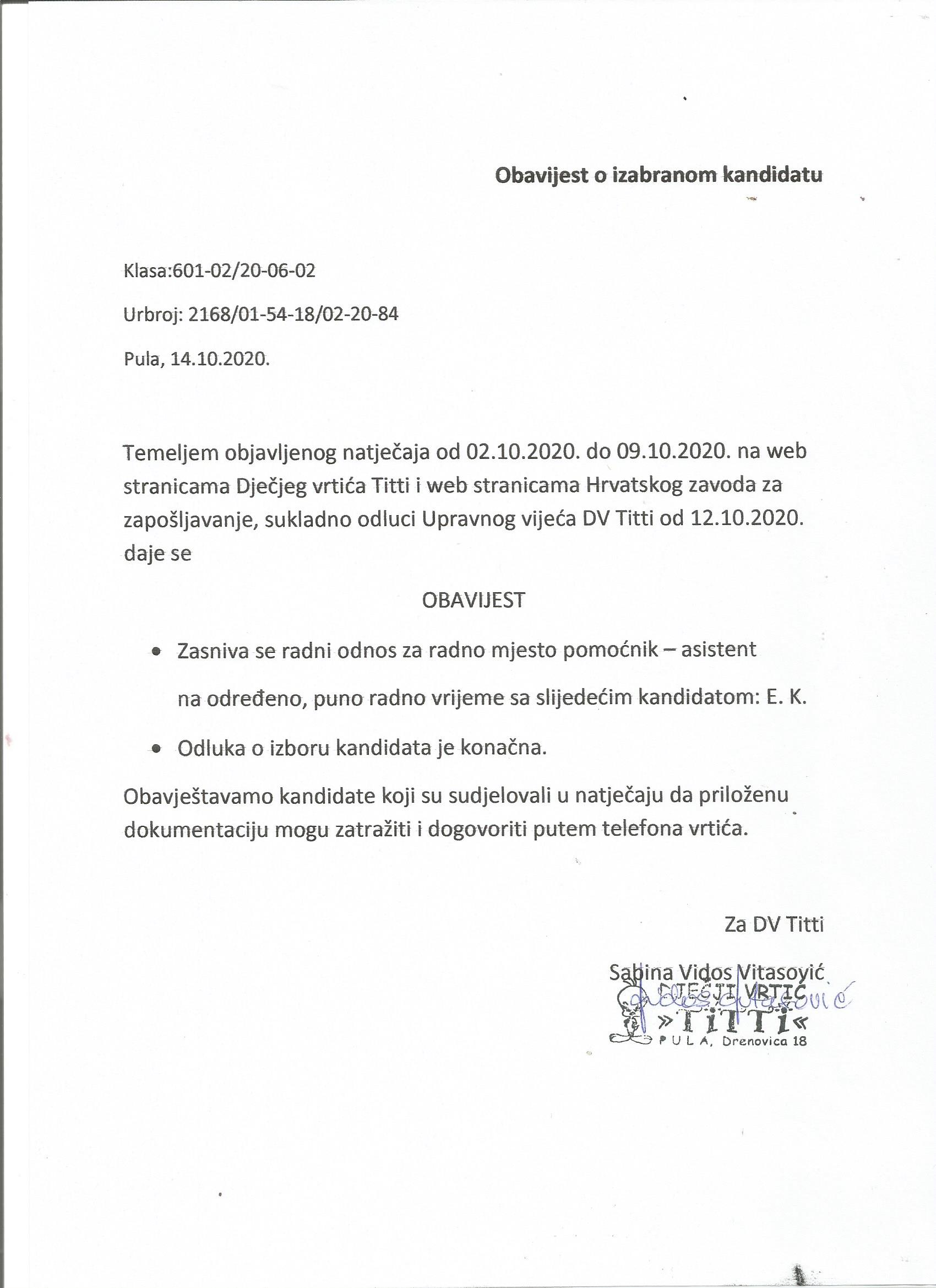 Temeljem objavljenog natječaja od 02.10. do 09.10.2020.na web stranicama DV Titti i oglasnoj ploči Hrvatskog zavoda za zapošljavanje..