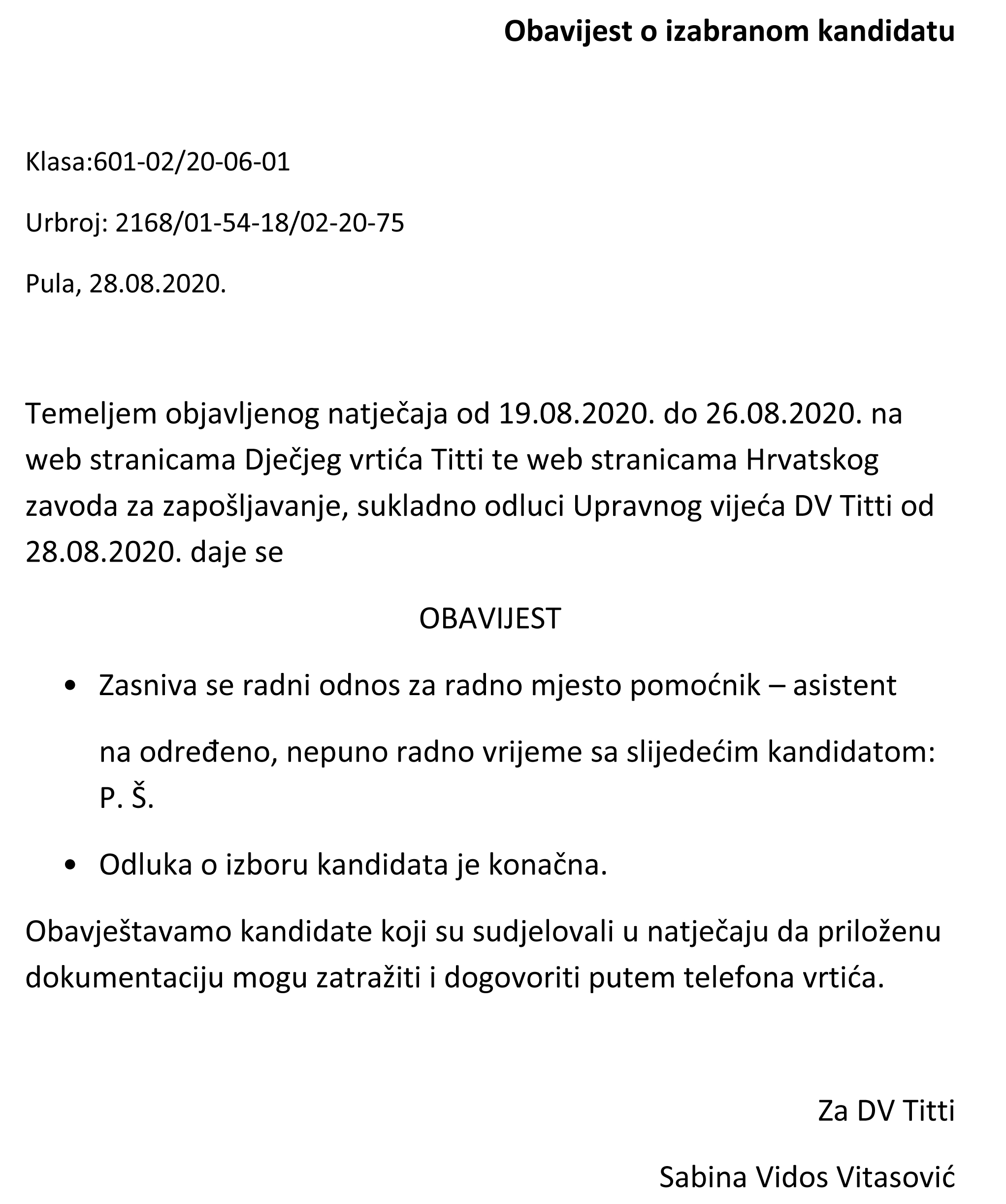 Temeljem objavljenog natječaja od 19.08. do 26.08.2020.na web stranicama DV Titti i oglasnoj ploči Hrvatskog zavoda za zapošljavanje..